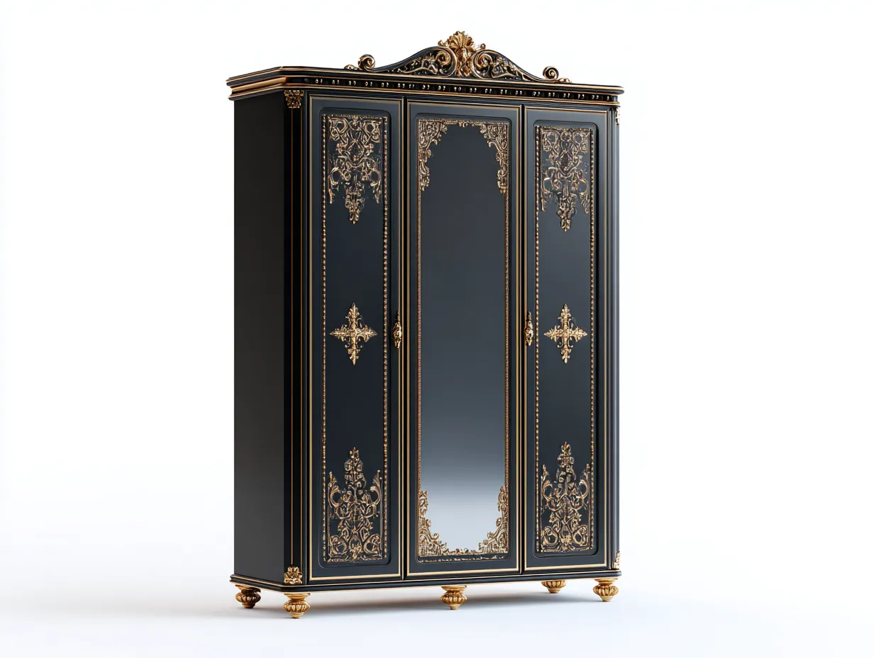 Armadio progettato per ambienti domestici dallo stile elegante, caratterizzato da una struttura compatta e da un forte impatto visivo. Le decorazioni e la composizione verticale lo rendono adatto a camere da letto con arredamento classico.