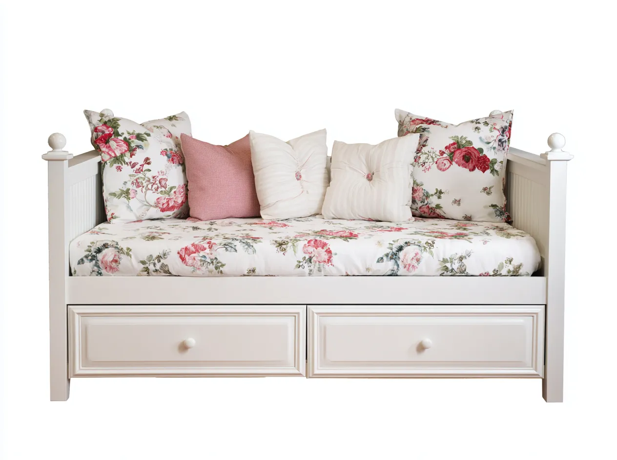 Divano letto dallo stile romantico e decorativo, adatto a soggiorno o camera per ospiti. La struttura compatta consente l'utilizzo come seduta quotidiana e come letto singolo, offrendo una soluzione funzionale e armoniosa per l'arredo domestico.